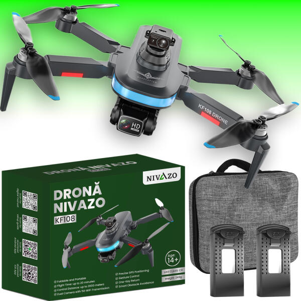 Nivazo KF108 drón - Korlátlan felfedezés Fedezze fel a kalandok teljesen új dimenzióját a Nivazo KF108 Nivazo KF108 drónnal, amely olyan fejlett technológiákkal van felszerelve, amelyekkel szabadon felfedezheti és látványos képekben örökítheti meg az Önt körülvevő világot. A 2200 mAh-s akkumulátorral ellátott drón akár 22 perc üzemidőt biztosít, amely ideális a lélegzetelállító fényképek és videók megszakítás nélküli rögzítéséhez. Főbb jellemzők Megnövelt hatótávolság - akár 22 perc folyamatos repülési idő. Follow Me funkció - a drón automatikusan követi Önt, tökéletes dinamikus filmezéshez és szelfik készítéséhez. Akadályelkerülés - intelligens technológia a biztonságos és stabil repülésért. Gesztusvezérlés - fényképek vagy videók készítése egyszerű kézmozdulatokkal. Dedikált mobilalkalmazás - teljes körű vezérlés közvetlenül a telefonjáról. Biztonság és megbízhatóság A drón beépített GPS-szel van felszerelve, ami biztosítja: Pontos és stabil repülést. Automatikus visszatérés a felszállási pontra a jel elvesztése vagy az akkumulátor lemerülése esetén. Így minden kalandot magabiztosan élvezhet, tudva, hogy drónja védett és készen áll minden kihívásra.